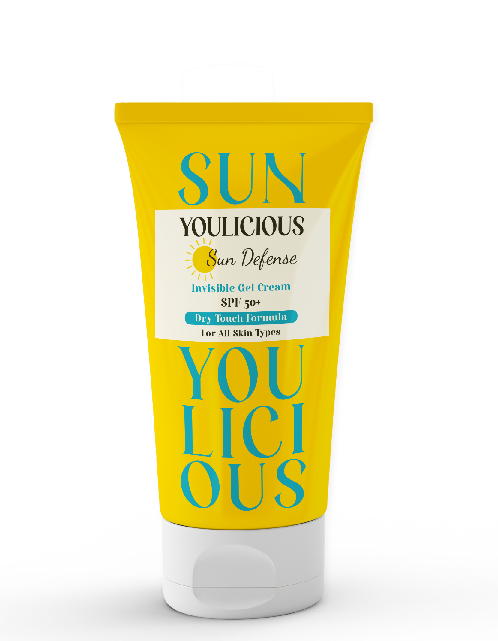 "Youlicious Sun Defense Invisible Gel Cream with SPF50+, advanced formula that provides broad spectrum protection (UVB, UVA, blue light & visible light), in addition to photoaging protection.